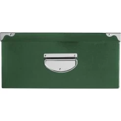 5Five Opbergdoos/storage box in de kleur groen met verstevigde metalen hoekstukken en hengsels. Afmetingen: L44 x B31 x H15 cm. Deze opslagboxen voor allerhande spullen, papieren, speelgoed, vakantiespullen etc zijn gemaakt van zeer stevig karton. Deze dozen hebben een uni kleur print in het groen met zilveren elementen, erg stijlvol. De dozen zijn verkrijgbaar in verschillende formaten. Serienaam: Greenbox.