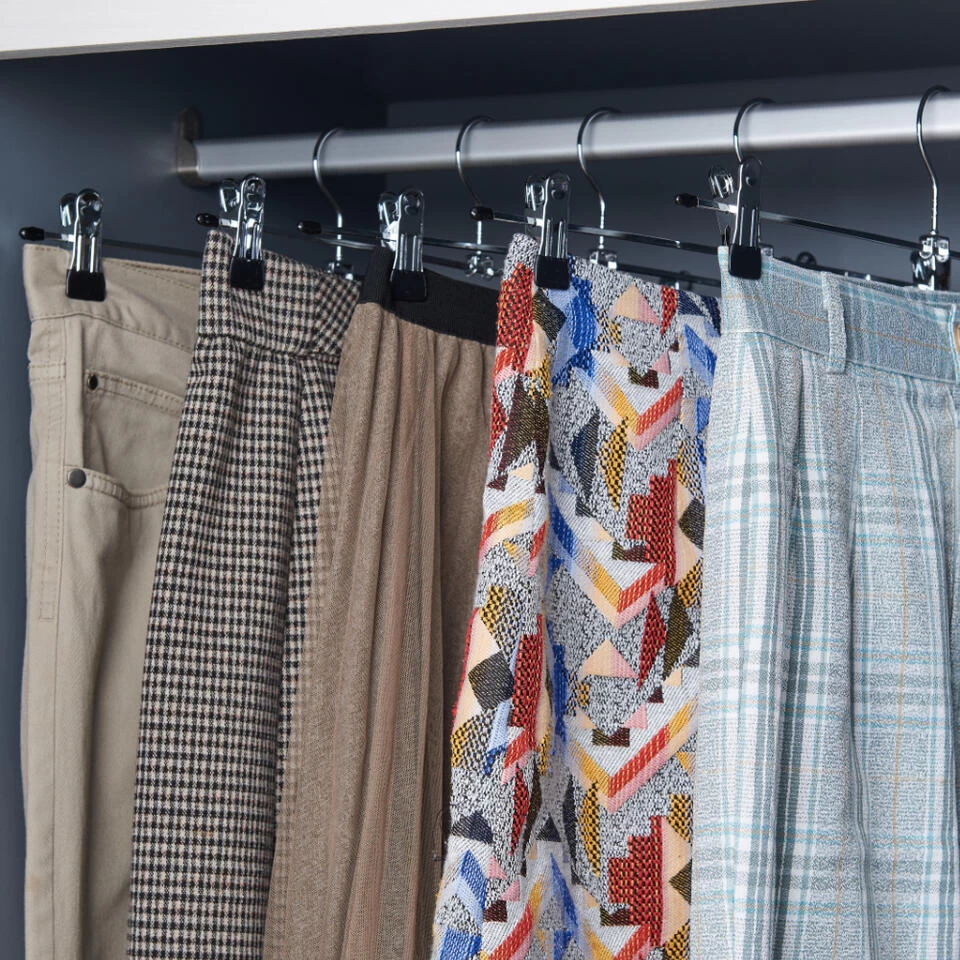 Heeft u hangers voor broeken of rokken nodig? Kies dan voor deze set van 20 stuks! De broekhangers zijn verstelbaar in breedte en dus geschikt voor het ophangen van broeken en rokken maar ook kleine zaken zoals handdoeken, sjaals, handschoenen, sokken, enz. En dat is nog niet alles! De haak kan 360° draaien en is dus super praktisch. Deze kledinghangers zijn gemaakt uit verchroomd metaal en hebben een PVC laag aan de klem. Dankzij de antisliplaag zullen uw kleren mooi blijven hangen, zonder plooien of kreuken. Als dat niet handig is!