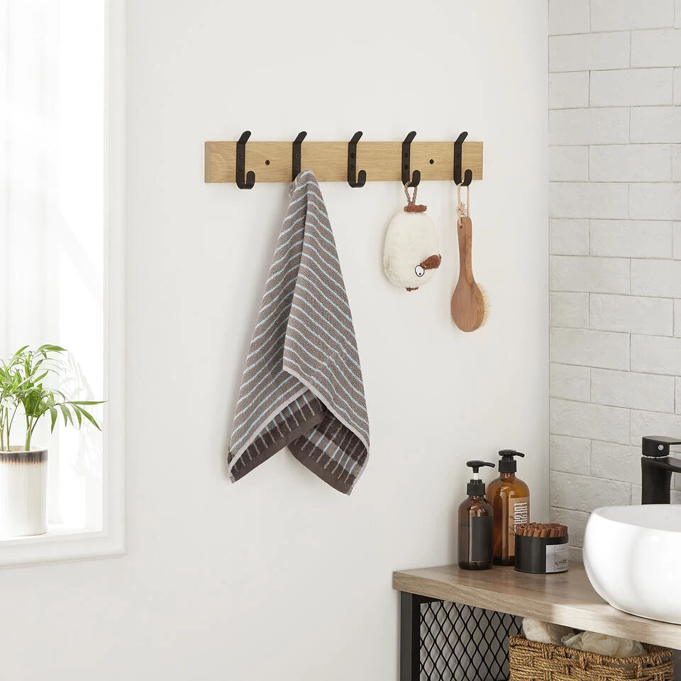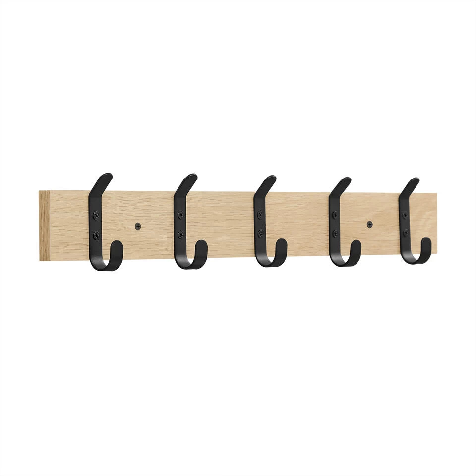 Deze compacte en moderne wandkapstok is ideaal als je niet veel plaats hebt in jouw inkomhal, keuken of slaapkamer. Hang er jouw jassen, t-shirts, handtassen of zelfs sleutels aan en geniet van een opgeruimde ruimte. Dankzij de lichte eikenkleur en de mat zwarte haken heeft deze lange kapstok een strakke, maar warme look. De haken zijn slim geplaatst zodat je 2 van deze kapstokken naast elkaar kan monteren. TIP! je kan deze wandkapstok eveneens combineren met dezelfde variant met 3 of 8 haken! Of wat dacht je van twee kapstokken schuin boven elkaar? Aan jou de keuze!