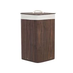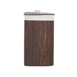 Wasmand met verwijderbaar deksel. Deze ruime mand zal een grote hulp zijn om je ruimte georganiseerd en opgeruimd te houden. Hij is gemaakt van natuurlijk bamboe, heeft een deksel met handvat en is gestoffeerd met een verwijderbare bijpassende stof. Dankzij zijn vorm past de mand in de hoek van een kamer zonder tegelijkertijd veel ruimte in te nemen. Het zal goed functioneren als wasmand en als opslag voor je accessoires.