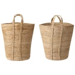 Set van 2 gevlochten opbergmanden. Geef je interieur een uniek natuurlijk karakter en houd het netjes met deze mandenset. De producten zijn handgemaakt van echte jute met oog voor detail zodat de accessoires jarenlang een lust voor het oog zijn. De manden zijn multifunctioneel, je kunt er dekens en kussens, en speelgoed in bewaren of ze als wasmand gebruiken.
