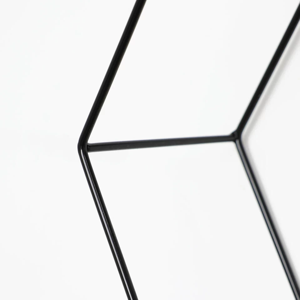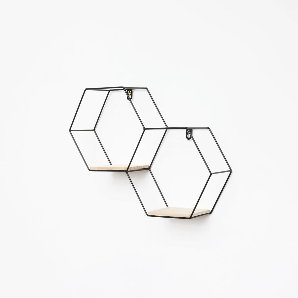 Op zoek naar een metalen wandrek om je interieur meer sfeer te geven? Wandrekken zijn dé trend van dit moment. Je kunt ze decoreren met jouw favoriete woonaccessoires. Dit hexagon wandrek heeft een zwart frame en bestaat uit twee zeshoeken voorzien van houten plankjes. De honingraat vorm maakt het rekje speels en eigentijds.