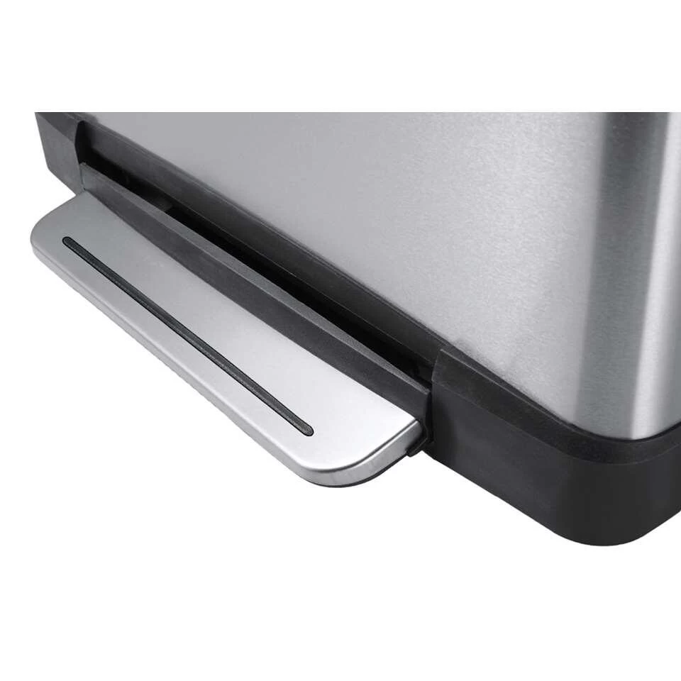 De stijlvolle rechthoekige EKO E-Cube recycling pedaalemmer 28+18 liter van mat RVS met fingerprint proof coating, heeft een extra breed pedaal en twee kunststof binnenemmers voor afvalscheiding. Voorzien van gedempt deksel met stay open functie voor het makkelijk schoonmaken en verwisselen van de afvalzak.