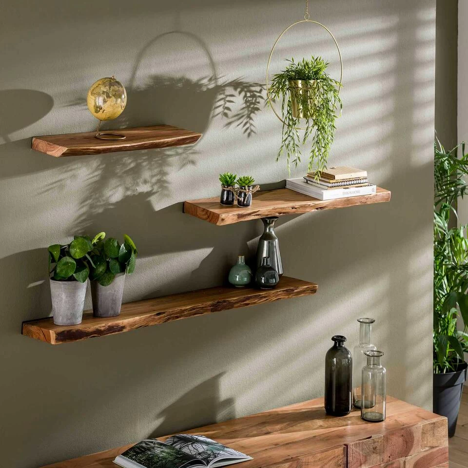 Deze natuurlijke wandplank Macy meet 90 cm en is gemaakt van massief acaciahout. De plank werd gelakt en is aan de zijkanten geschuurd. Op foto 4 kun je zien hoe de blinde bevestiging die inbegrepen is eruit ziet. De wandplank is verkrijgbaar in meerdere formaten die je kunt combineren om je muur erg mooi aan te kleden.Â