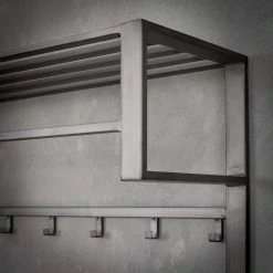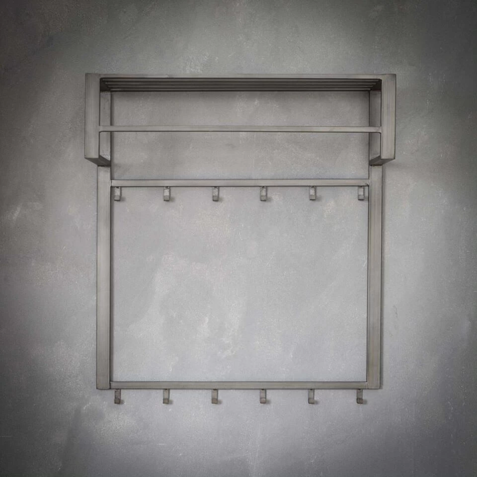 Deze kapstok is uitgevoerd in grijs gepoedercoat staal. Het model is voorzien van een half open hoedenplank, een roede en 12 haakjes. Aan deze multifunctionele kapstok kunnen dus jassen zowel aan een haakje als aan een hanger worden opgehangen. Er is zelfs plek voor sjaals of petjes op de hoedenplank. De onderste haakjes hangen bovendien op de juiste hoogte voor kinderen, zodat ook zij hun jasje kwijt kunnen. De kapstok is verder voorzien van twee bevestigingsogen aan de achterzijde, zodat hij eenvoudig aan de wand kan worden gemonteerd.