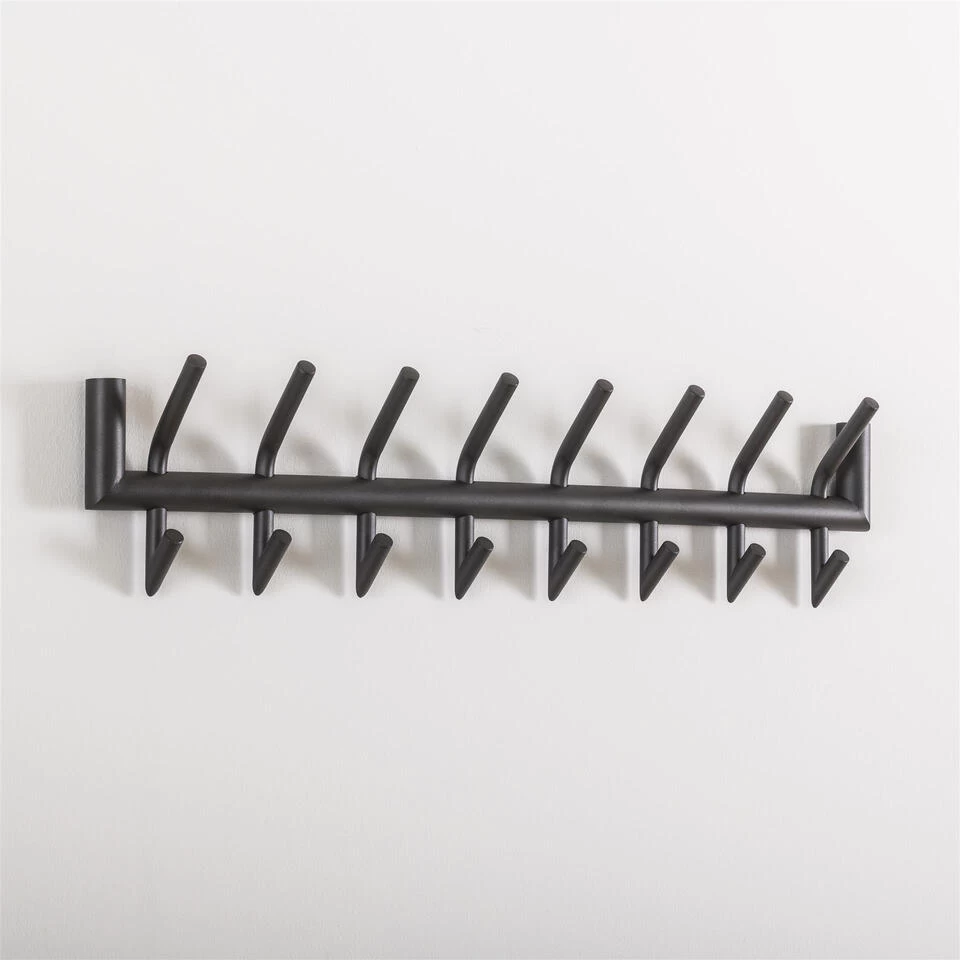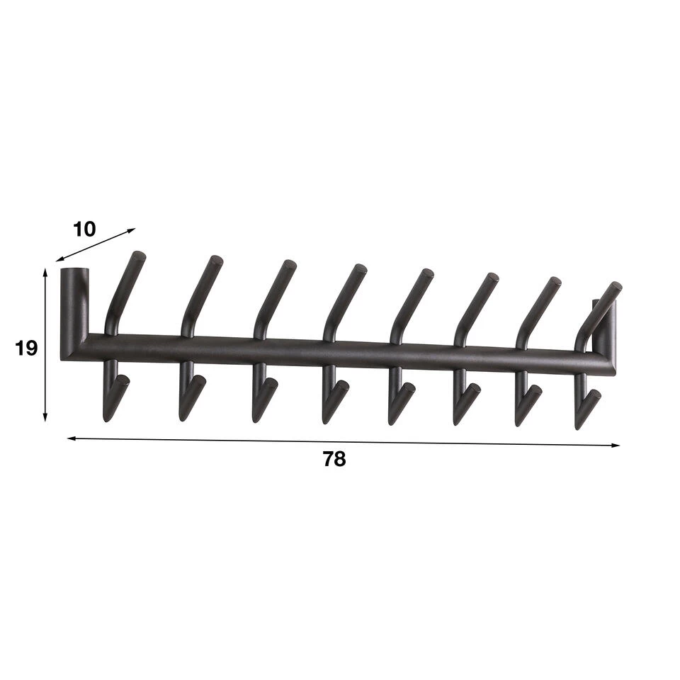 Deze kapstok heeft een ronde buis, uitgevoerd in donkergrijs mat gepoedercoat staal. In totaal heeft dit model 8 gelaste haakjes, die zowel aan de bovenkant als aan de onderkant een ophangmogelijkheid hebben. De stoere kapstok wordt opgebouwd geleverd en kan door middel van twee bevestigingspunten eenvoudig aan de wand worden gemonteerd. Deze kapstok heeft ook een 6- haaks uitvoering.