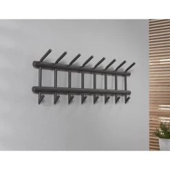 Deze kapstok heeft een ronde buis, uitgevoerd in donkergrijs mat gepoedercoat staal. In totaal heeft dit model 8 gelaste haakjes, die zowel aan de bovenkant als aan de onderkant een ophangmogelijkheid hebben. De stoere kapstok wordt opgebouwd geleverd. Vervolgens is hij middels 2 bevestigingsogen eenvoudig aan de wand te monteren.