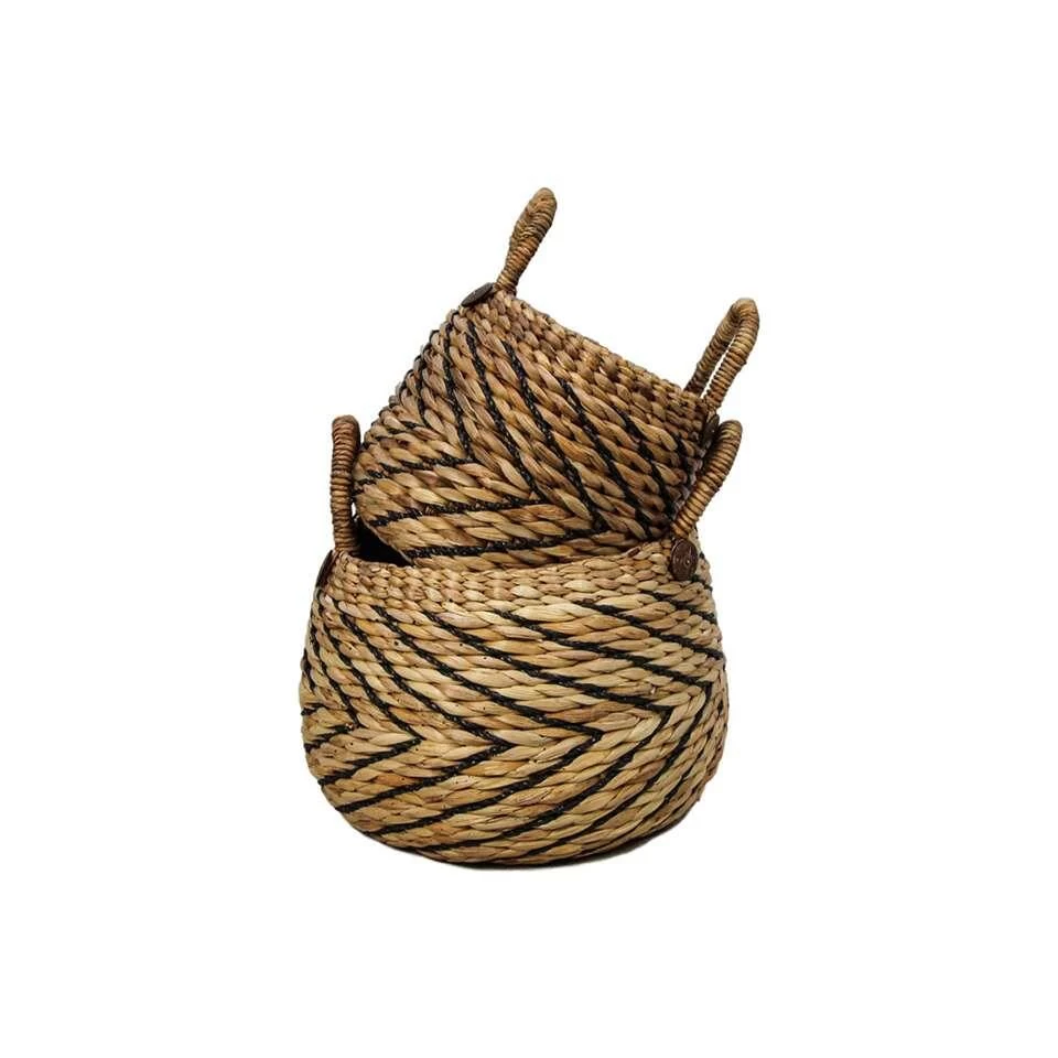 Deze handgevlochten kleine opbergmanden zijn gemaakt van waterhyacint en hebben daarom een natuurlijke look. De mandjes hebben een trendy zigzag patroon. In deze decoratieve manden kun je van alles opbergen. Denk hierbij bijvoorbeeld aan accessoires, cosmetica en andere losse spullen. De manden hebben 2 verschillende maten. Hierdoor kunnen ze gemakkelijk in elkaar kunnen worden opgeborgen. Aangezien het een natuurlijk product betreft, kunnen afwijkingen in vorm en kleur optreden. De afmetingen van de mandjes zijn ø40×42, ø30×36 cm.