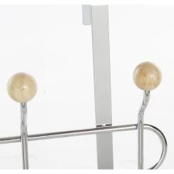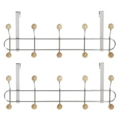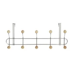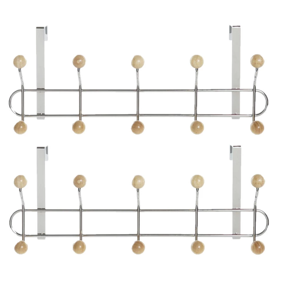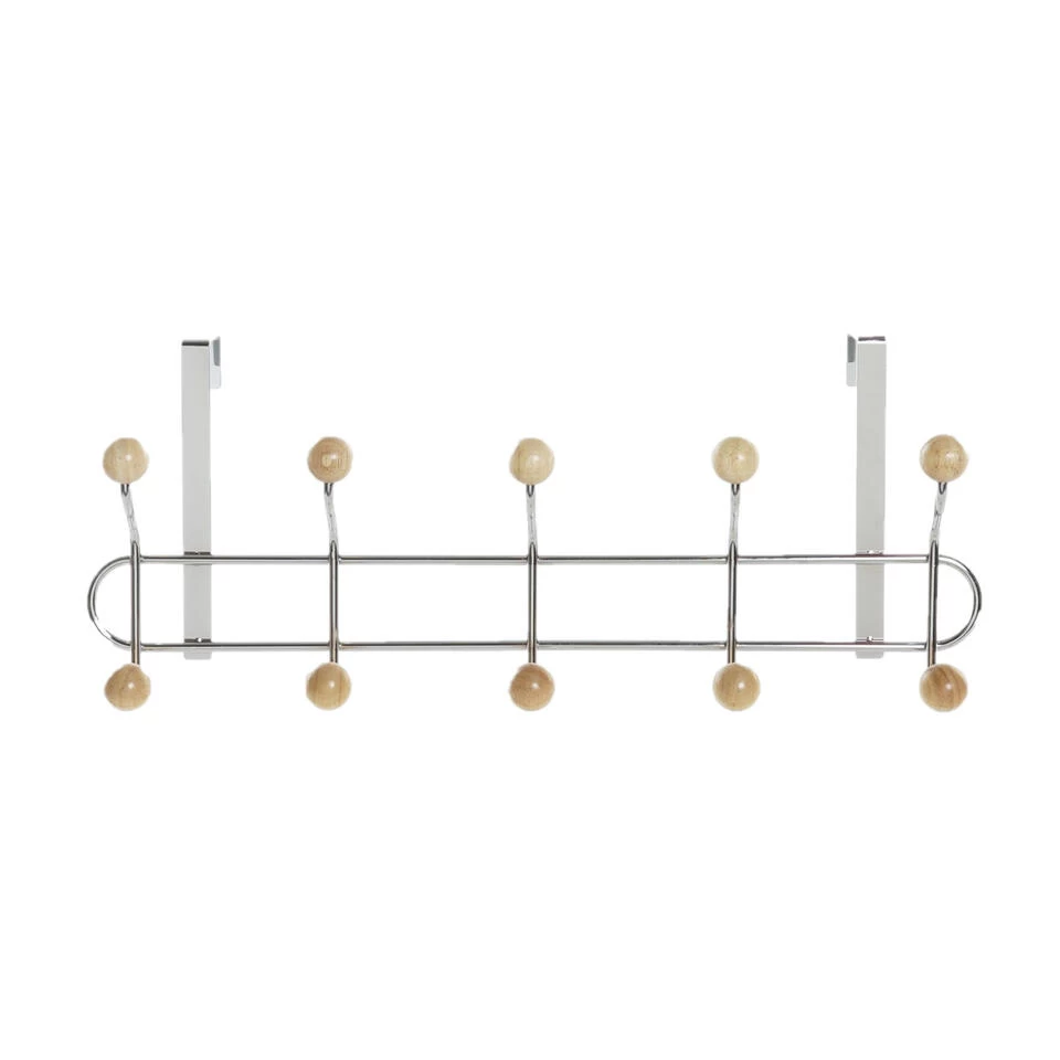 Deurkapstok/rek zilver. De kapstok heeft 10 haken van hout en is enkel geschikt voor een stompe deur met een maximale dikte van 4 cm. Afmeting: ca. L45 x B7 x H19 cm. Materiaal: metaal.