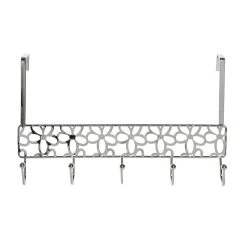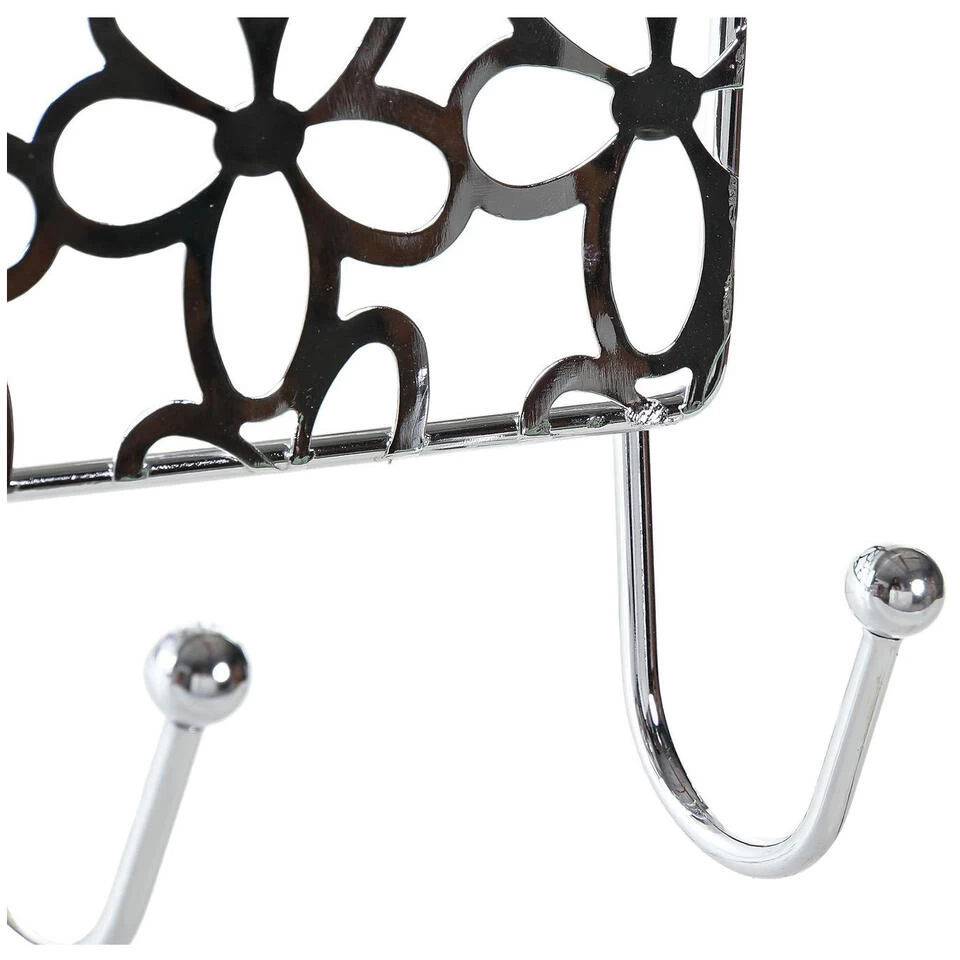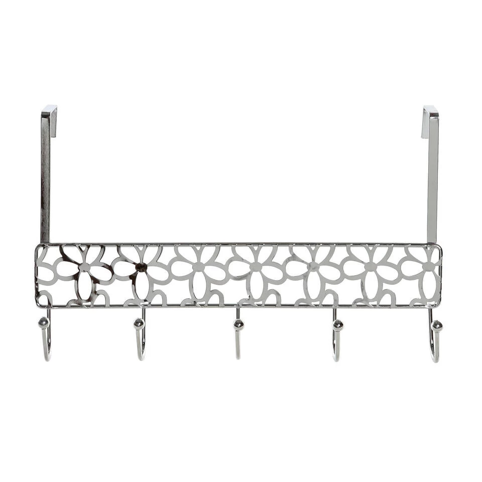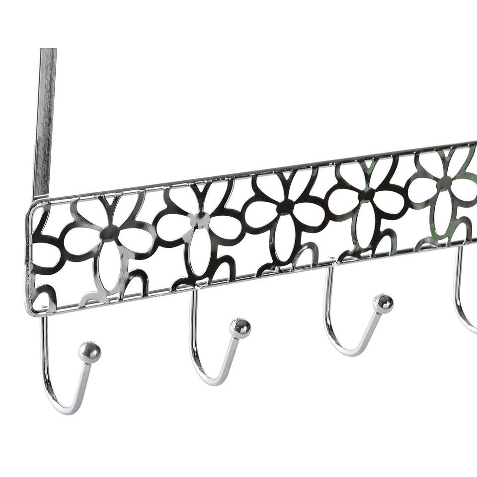 Een kapstok zilver met bloemenpatroon en 5 haken, welke u aan uw deur kunt hangen. Let op: Enkel geschikt voor stompe deuren van 40 mm dik. Afmeting: ca. L32 x B10 x H19 cm. Materiaal: metaal. Deurhanger kapstokken badkamer/slaapkamer accessoires.