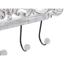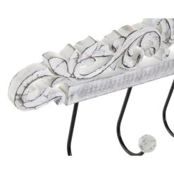 Items kapstok rek voor aan de muur/wand in de kleur wit met sierlijk ornament aan bovenzijde. Ideaal om je jassen en hoofddeksels aan op te hangen, dankzij de 4x ophanghaken/knoppen is er genoeg ruimte om diverse stukken op te hangen. Afmeting: 35 x 6.5 x 20 cm. Materiaal: Mangohout/metaal. Wandkapstokken.