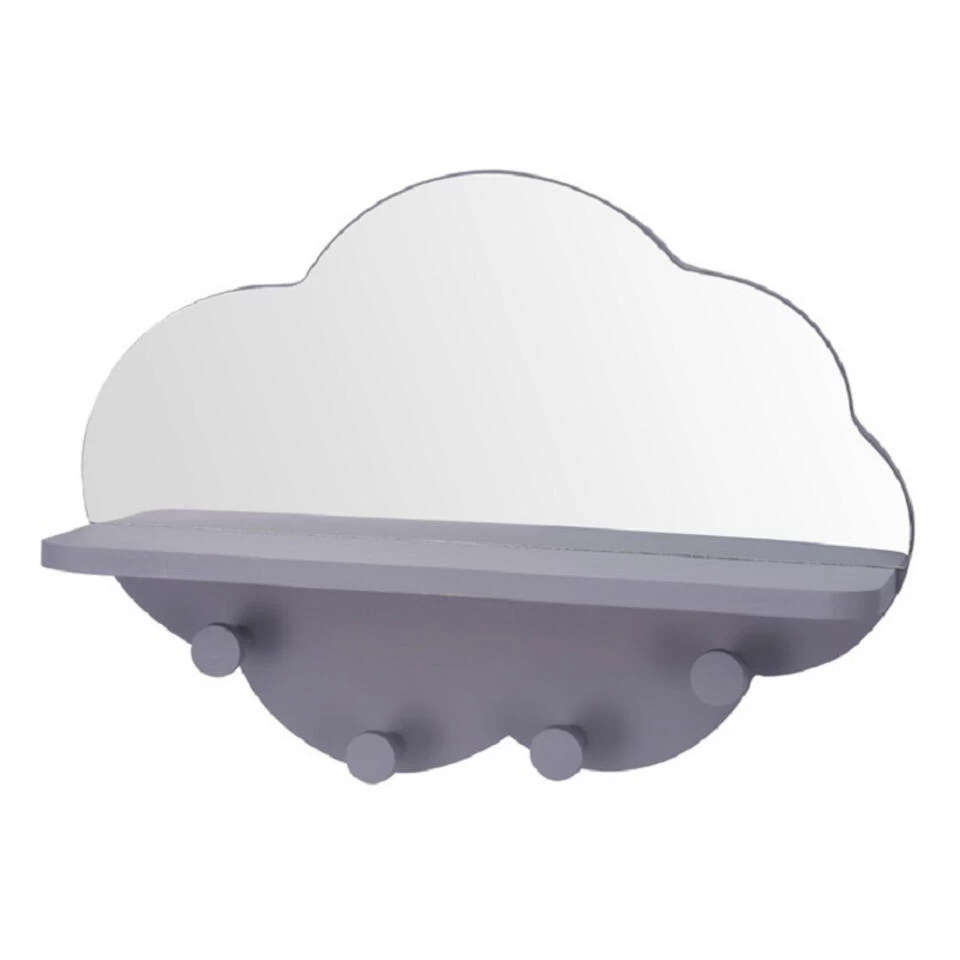 Grijze wolk kapstok met spiegel, voor in de kinderkamer/babykamer. Een leuke kapstok met 4 ronde haken, in de vorm van een wolk. In het midden van de wolk zit een klein plankje, aan de bovenkant een spiegel. De kapstok heeft 2 ophanghaken aan de achterkant waarmee u deze aan de muur kunt ophangen, bevestigingsmateriaal niet inbegrepen.