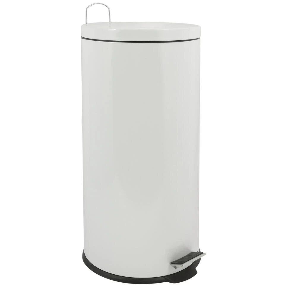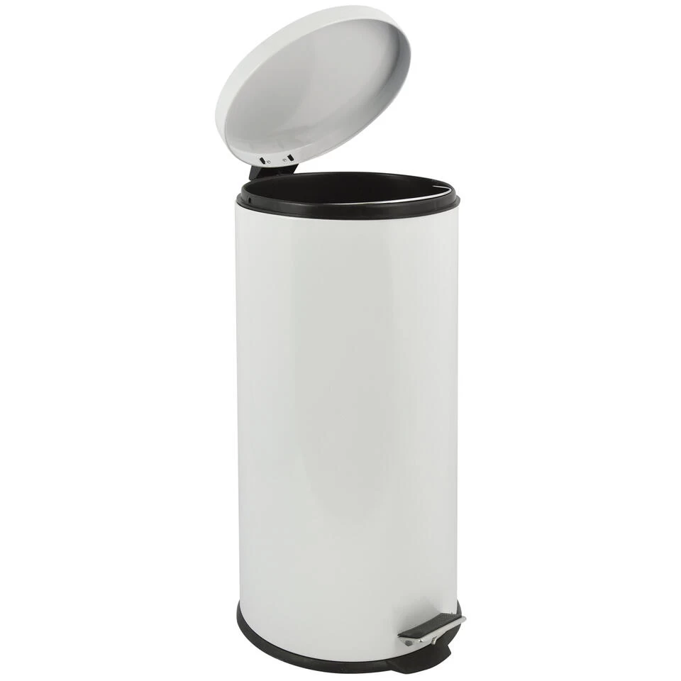 Pedaalemmer met inhoud van 30 liter. Deze prullenbak is gemaakt van rvs en metaal en heeft een formaat van ca. D29 x H63 cm. Deze medium/large-size pedaalemmers hebben een uitneembare zwarte binnenbak. De deksel is ook wit. Geschikt voor o.a. kamer en kantoor.