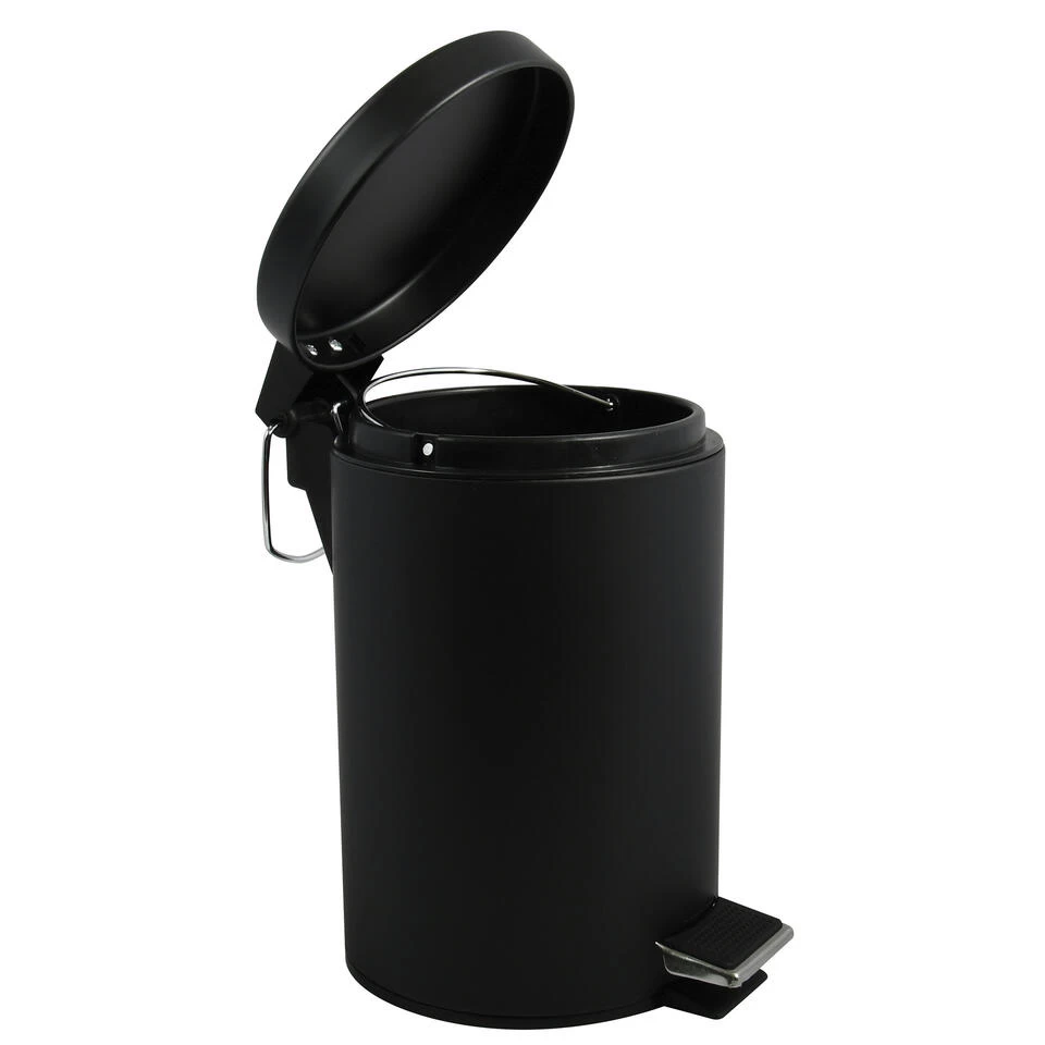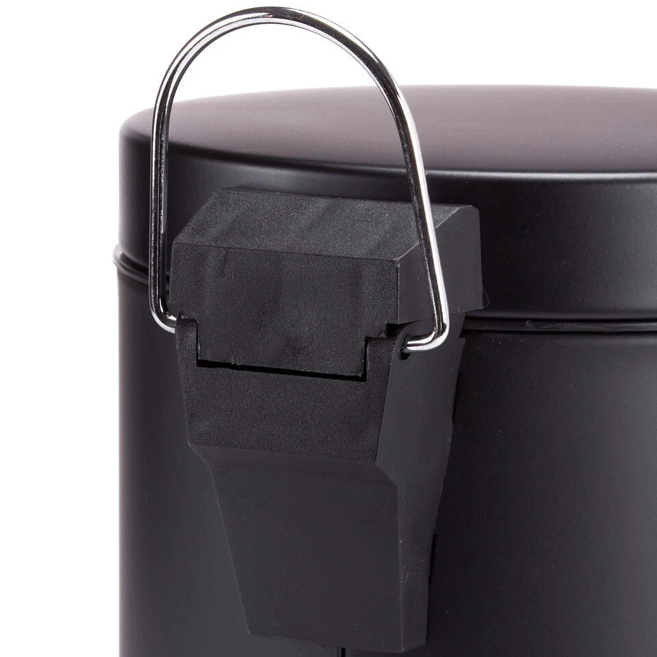 Pedaalemmer voor badkamer en toilet, klein model met inhoud 5 liter. Deze prullenbak is gemaakt van rvs en metaal en heeft een formaat van ca. L20 x H28 cm. Deze kleine pedaalemmers hebben een uitneembare binnenbak. De deksel is ook zwart.