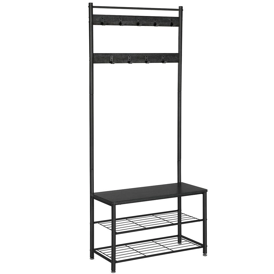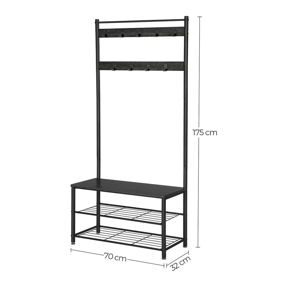 STABIEL EN VEILIG: Met 4 verstelbare poten kan de kapstok perfect stabiel staan op tapijten of oneffen vloeren. Meegeleverd zijn 2 anti-omval banden om te zorgen dat het garderoberek niet omvalt en om veilig gebruik te garanderen. Uitgevoerd met robuuste metalen buizen, MDF in rustieke stijl en een sterke en stevige bank die tot 80 kg kan dragen, zodat een volwassene er makkelijk op kan zitten.