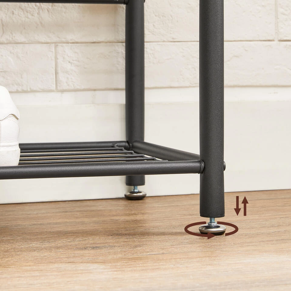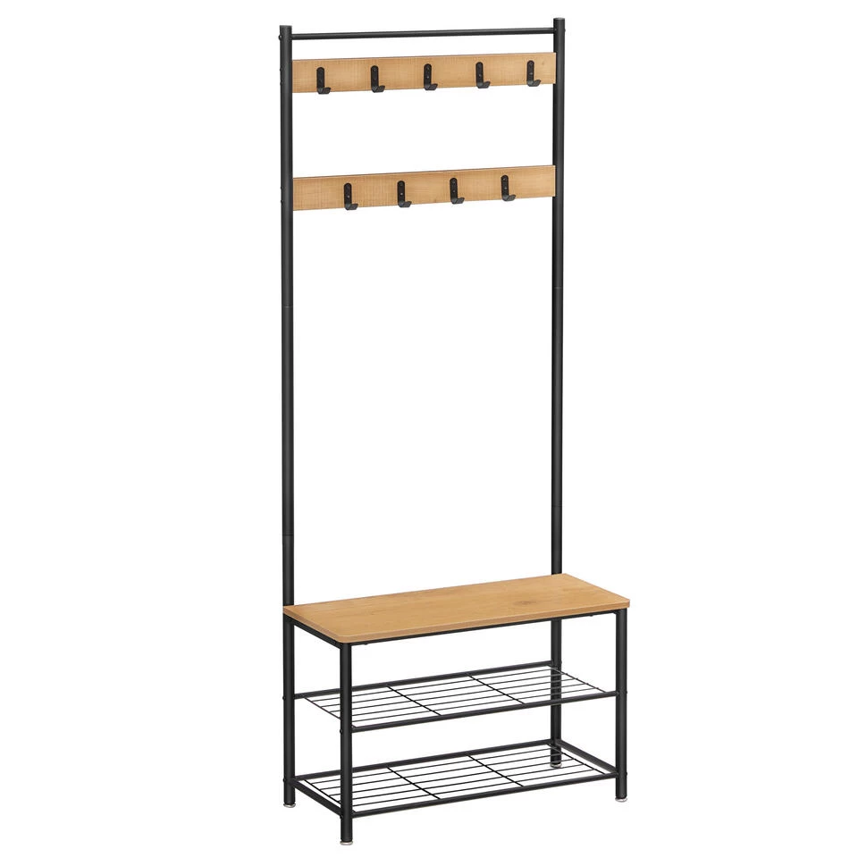 Deze industriële kapstok met 9 haken en schoenenrek met ruimte voor 6 paar schoenen is de uitkomst voor uw hal. Dit garderoberek met stevige ijzeren frame past moeiteloos in uw gang of zelfs slaapkamer door zijn luxe uitstraling.
