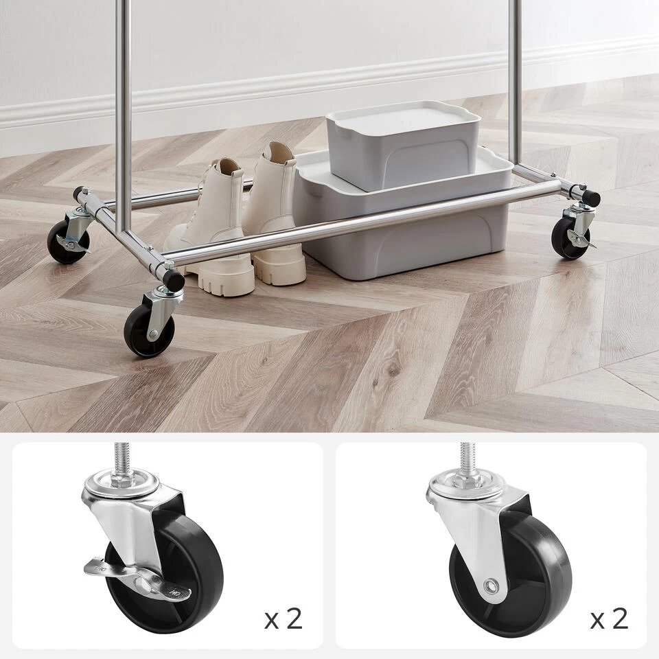 GEMAKKELIJK TE VERPLAATSEN EN MONTEREN: met 4 gewapende 360° zwenkbare PP-zwenkwielen (waarvan 2 met remmen), is deze ophangrail voor kleding simpel te verplaatsen, geen gereedschap nodig, geen moeren en bouten, dus u kunt de rail binnen 1 minuut installeren en dus snel in gebruik nemen.