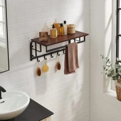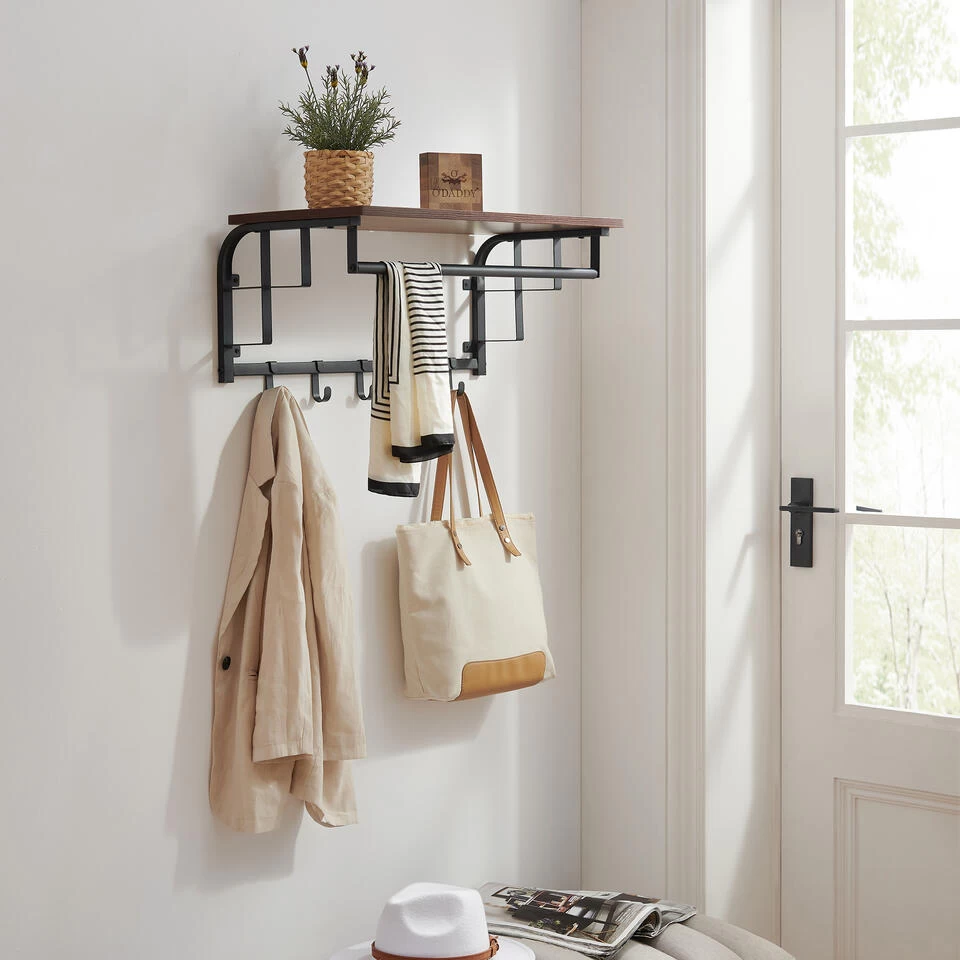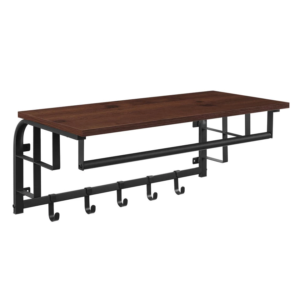 Een stijlvolle wandkapstok verandert een lege muur in een handige ruimte om uw jassen, tassen, paraplu’s en sleutels te organiseren en bij de hand te houden. Deze kapstok combineert een rustieke plank in kersenhout kleur met een zwarte omlijsting, waardoor uw hal een industriële chique uitstraling krijgt. Past perfect in uw entree, gang of slaapkamer. Zie ook onze andere modellen wandkapstokken, staande kapstokken en garderoberekken.