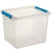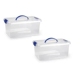 Opslagbak/organizer met deksel 10 liter transparant met formaat 38,5 x 23 x 17,5 cm. Transparante opbergbakken met deksel welke is voorzien van blauwe sluitclips en hengsel. Handig voor het opbergen van spulletjes. Inhoud: ca. 10 liter. Materiaal: kunststof (plastic).