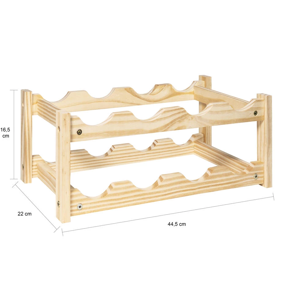 Dit wijnrek liggend is gemaakt en van robuust hout, wat zorgt voor een eigentijdse en neutrale uitstraling. De flessen liggen door het voorgevormde design altijd stevig in deze compacte en fijne wijnkast. Het model heeft een afmeting van 22 x 44,5 x 16,5 cm (lxbxh) en is hierdoor een handige accessoire voor op bijvoorbeeld dressoirs.