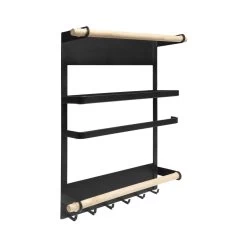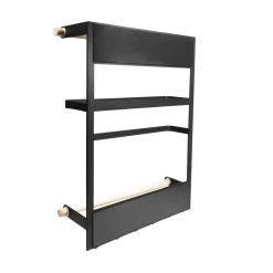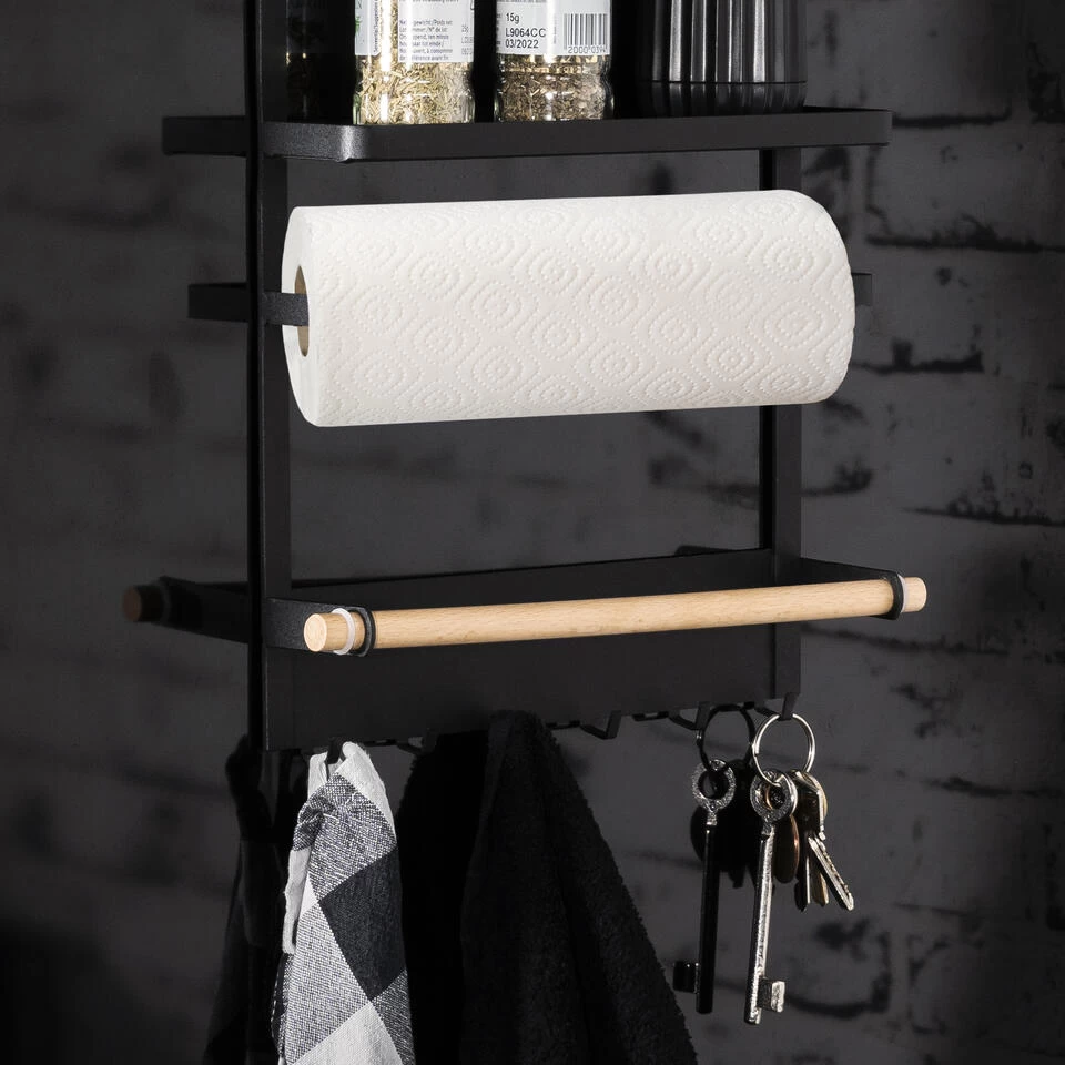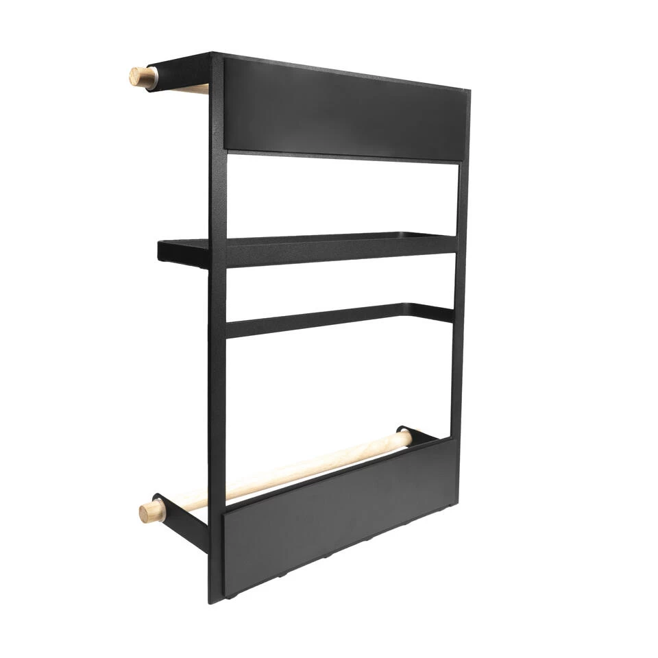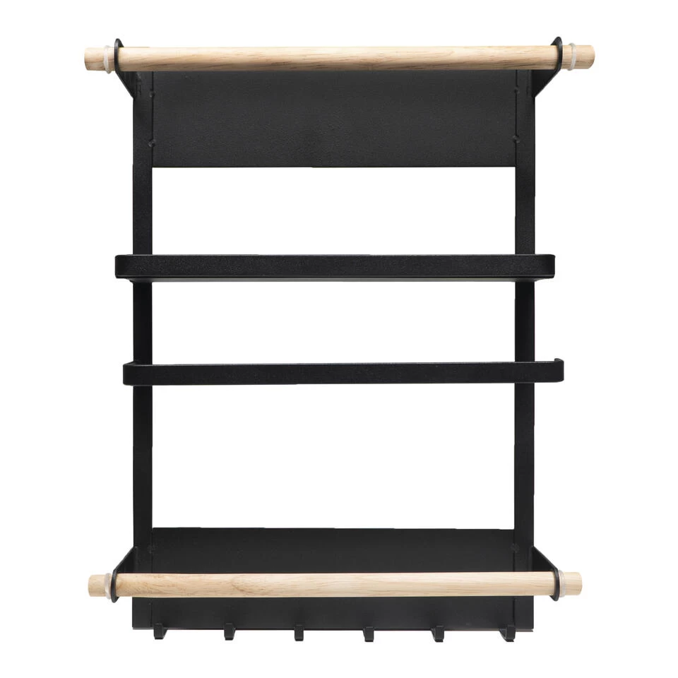 Het keukenrek in het zwart met magneetstrip is 35 cm hoog, 27 cm breed en 7,5 cm diep. Het plateau waar potjes opgezet kunnen worden meet 5,5 x 24 cm. Hij past daardoor op (bijna) elke koelkast,maar is natuurlijk ook te bevestigen aan alle magnetische oppervlakten. Bovenaan het rekje is een houten stang om wat aan te hangen of bijvoorbeeld een bord achter te zetten. Dat bord kan dan ondersteund worden door het metalen plankje eronder. Onder het plankje bevind zich een metalen stang,met een opening aan de zijkant. Vervolgens is er weer een houten stang. Helemaal onderaan zijn ook nog een aantal metalen haakjes te vinden,hier kunnen handdoeken aan opgehangen worden.