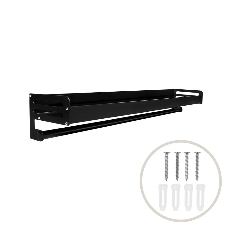 De QUVIO Keukenrek met schap en 10 ophanghaken staal is een keukenrek met een schap die uitstekend uitkomt om dingen aan op te hangen. Aan het rek kun je ophangen wat je zelf wilt en je kunt het rek zelf ook plaatsen waar je wilt in de keuken. Het rek is zwart van kleur en bevat losse ophanghaken die gebruikt kunnen worden om bijvoorbeeld theedoeken of handdoeken aan op te hangen.