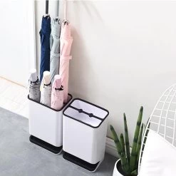 De QUVIO parapluhouder heeft ruimte voor maar liefst 6 paraplu’s. Groot of klein of opvouwbaar,het formaat speelt geen rol. Heeft die van jou een ijzeren pin aan de top? Geen probleem. De bodem van deze paraplubak heeft speciale groeven,zodat de pin het kunststof niet beschadigt. Het compacte design zorgt ervoor dat de QUVIO parapluhouder niet te veel plaats inneemt en daarom perfect in de hoek van de kamer past. Het strakke ontwerp zal bovendien goed passen in de moderne stijl van je woning.