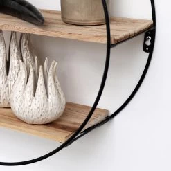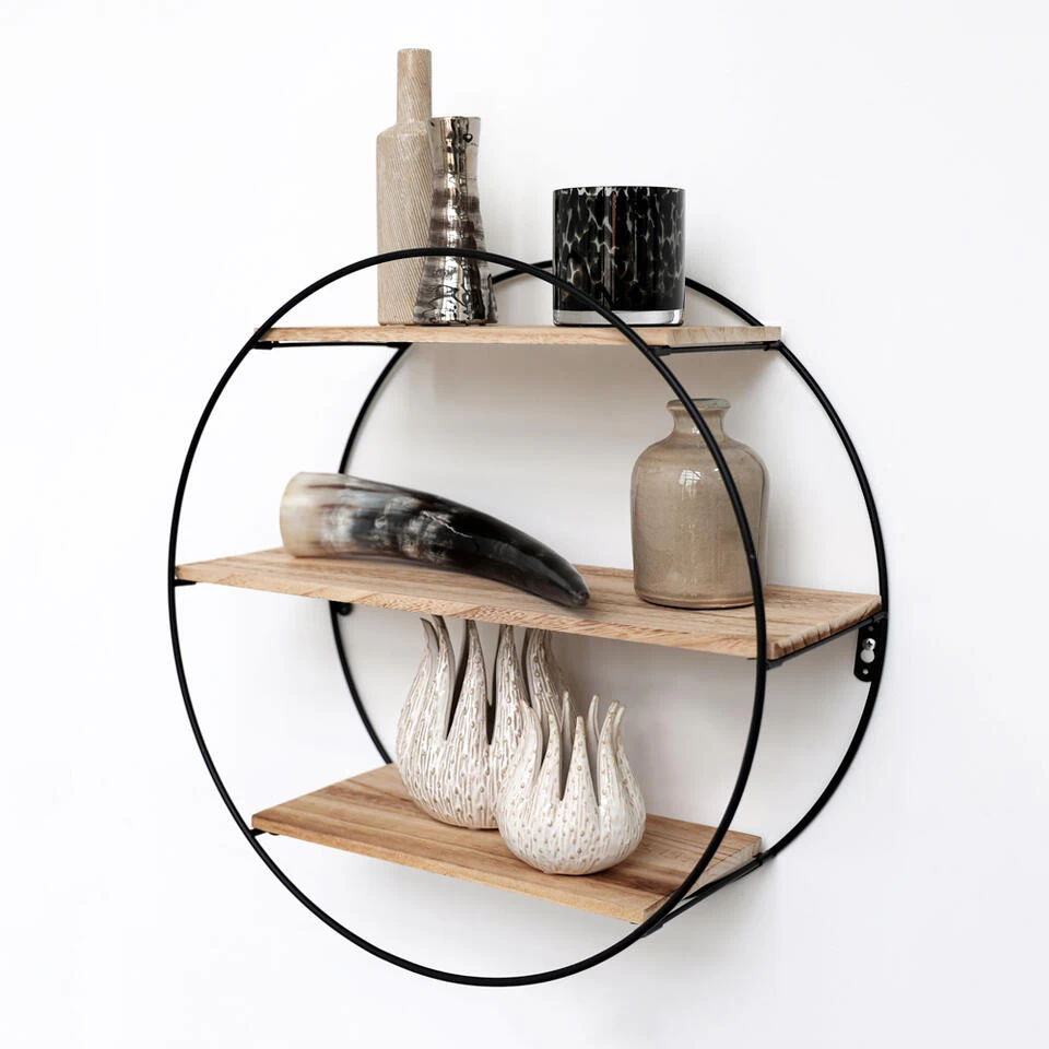 Op zoek naar een metalen wandrek om je interieur meer sfeer te geven? Wandrekken zijn dé trend van dit moment en kun je decoreren met jouw favoriete woonaccessoires. Dit ronde wandrek heeft een mat zwart frame en 3 houten plankjes.